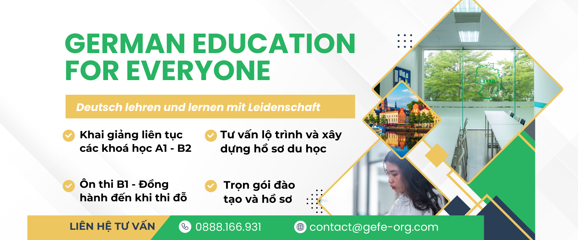Bằng sự tận tâm trong giảng dạy, nền tảng kiến thức chuẩn mực và môi trường học tập chuyên nghiệp, GEFE mang đến cho học viên sự an tâm và niềm tin trên hành trình chinh phục tiếng Đức, chuẩn bị vững vàng cho con đường học tập và du học nghề tại Đức.