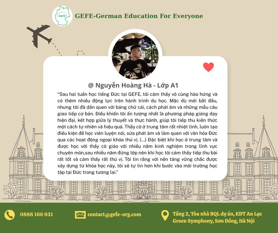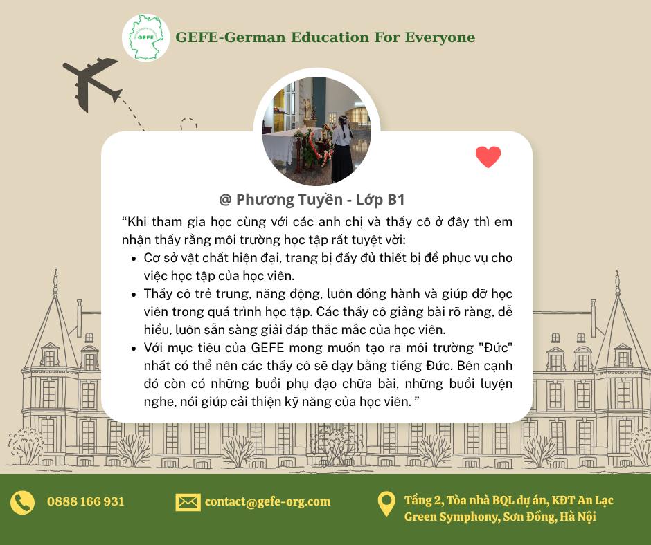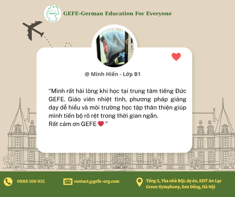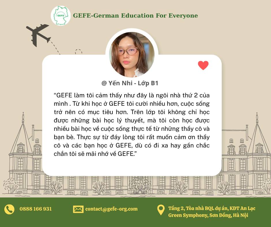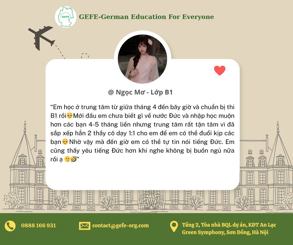 Từng đỗ Đại học Dược Hà Nội, Kiều đã chọn một lối đi mới: học tiếng Đức và theo đuổi ước mơ du học. Với sự nỗ lực không ngừng, Kiều đã xuất sắc giành được học bổng trị giá 20 triệu đồng từ GEFE – một phần thưởng xứng đáng cho tinh thần cầu tiến và bền bỉ. Hiện tại, Kiều đã chính thức sang Đức và bắt đầu hành trình du học ngành Điều dưỡng, từng bước chạm tới ước mơ của mình.
