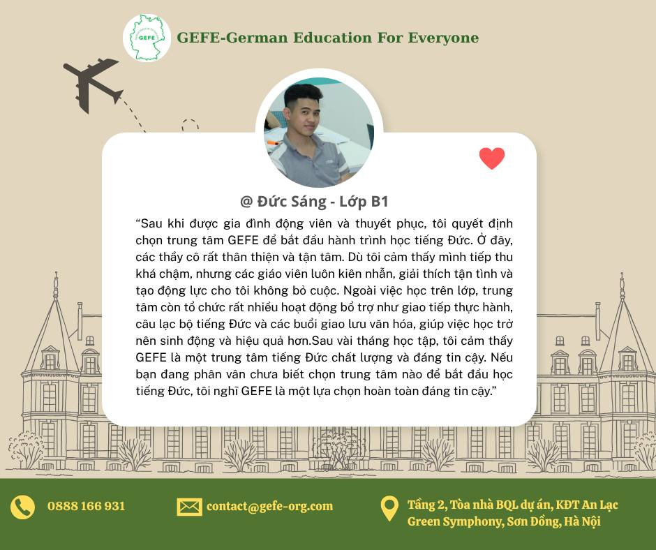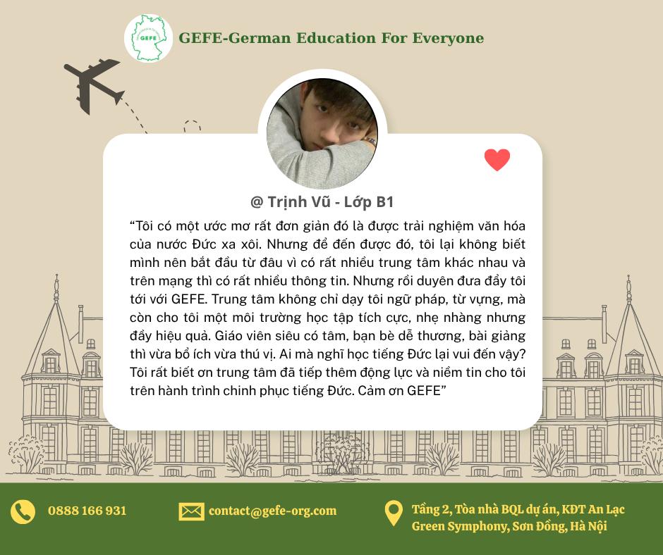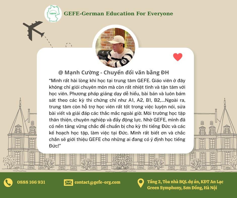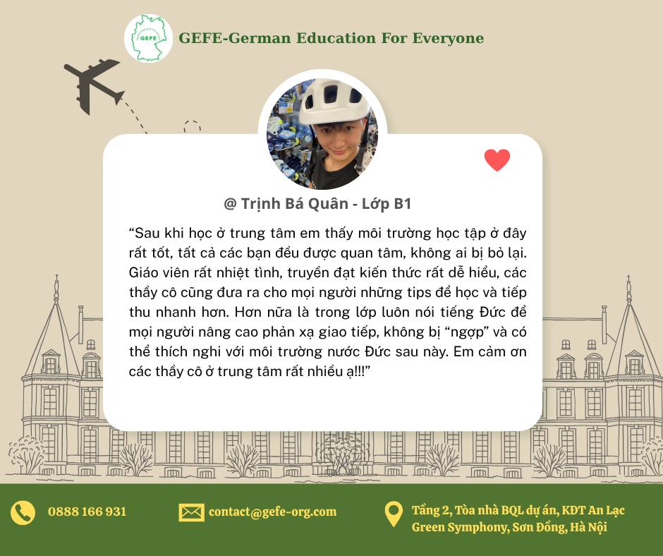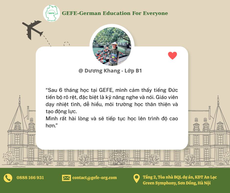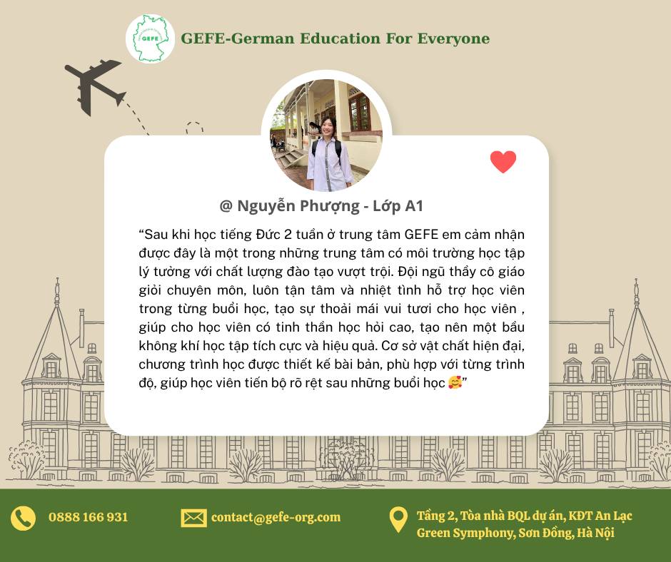 Từng đỗ Đại học Dược Hà Nội, Kiều đã chọn một lối đi mới: học tiếng Đức và theo đuổi ước mơ du học. Với sự nỗ lực không ngừng, Kiều đã xuất sắc giành được học bổng trị giá 20 triệu đồng từ GEFE – một phần thưởng xứng đáng cho tinh thần cầu tiến và bền bỉ. Hiện tại, Kiều đã chính thức sang Đức và bắt đầu hành trình du học ngành Điều dưỡng, từng bước chạm tới ước mơ của mình.